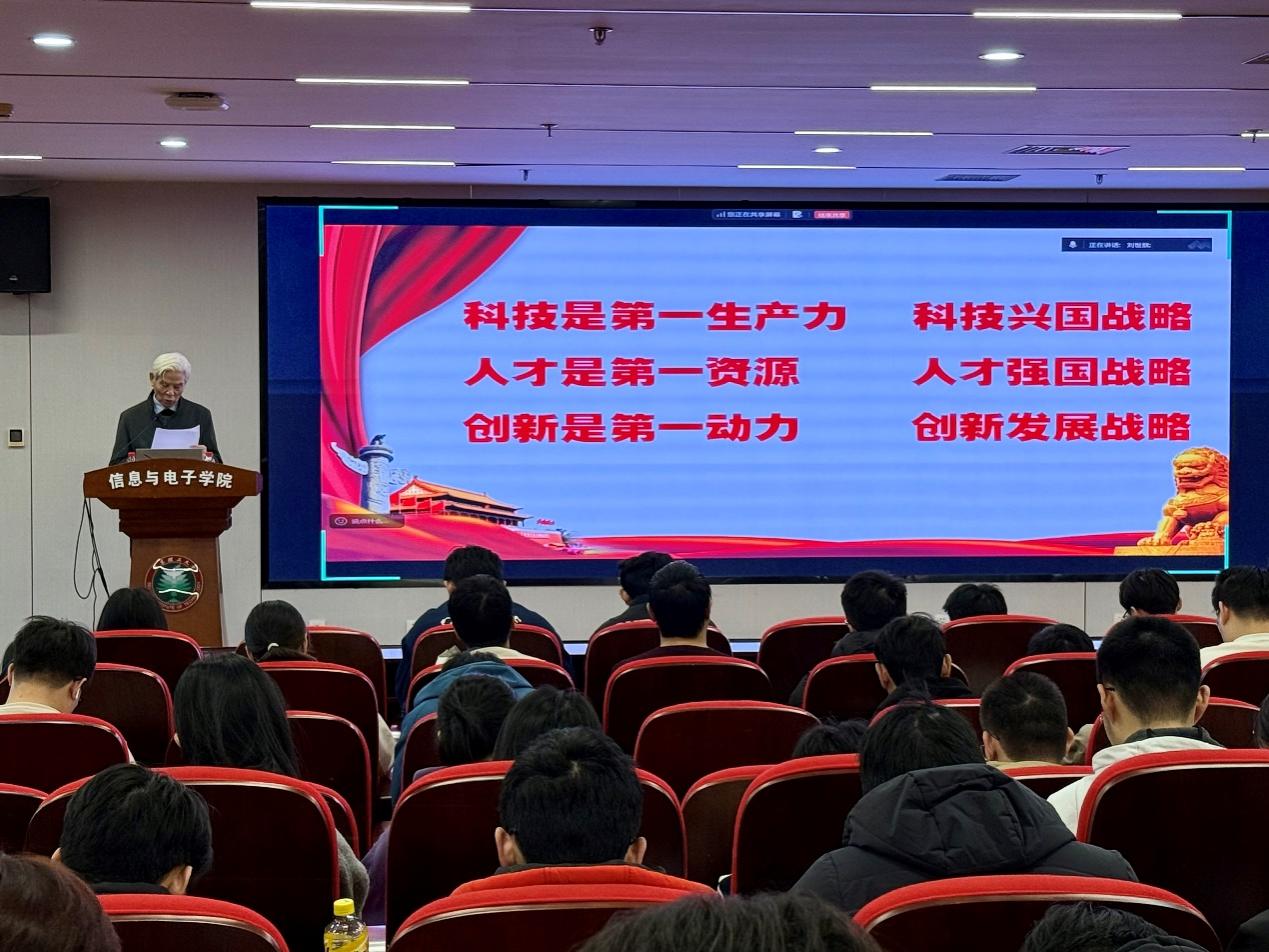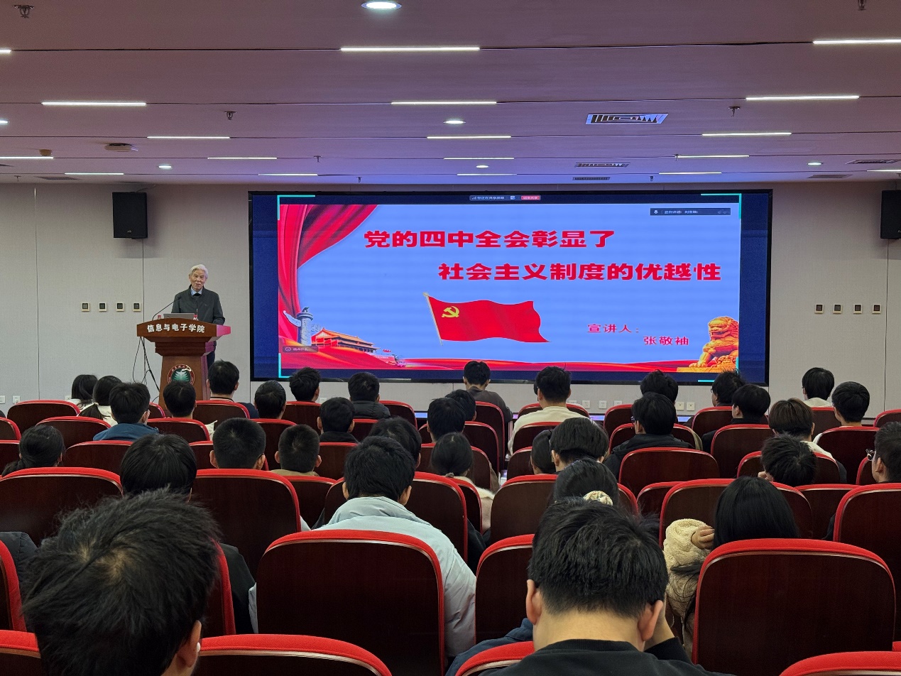 为引导入党积极分子学习领会党的二十届四中全会精神,感悟中国特色社会主义制度优越性,北京理工大学信息与电子学院邀请学校原党委副书记、纪委书记、学校关工委“五老”思政导师张敬袖走进学院师生,以“党的二十届四中全会彰显了社会主义制度的优越性”为题讲授专题党课。学院党委副书记、副院长侯明佳,学生工作部学生一室主任王晓静以及130余名入党积极分子聆听了党课。党课由学院研工委书记潘欣主持。