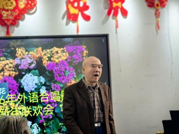董兆波为活动致辞。他首先为老同志们送上新春祝福,并对外语合唱团成员们对艺术的热爱表示肯定。他指出,外语合唱团始终以歌声为桥,既传承经典旋律、抒发家国情怀,又演绎多元外语曲目、传递跨文化魅力,不仅丰富了大家的精神文化生活,更展现了团队积极向上、团结协作的良好风貌。