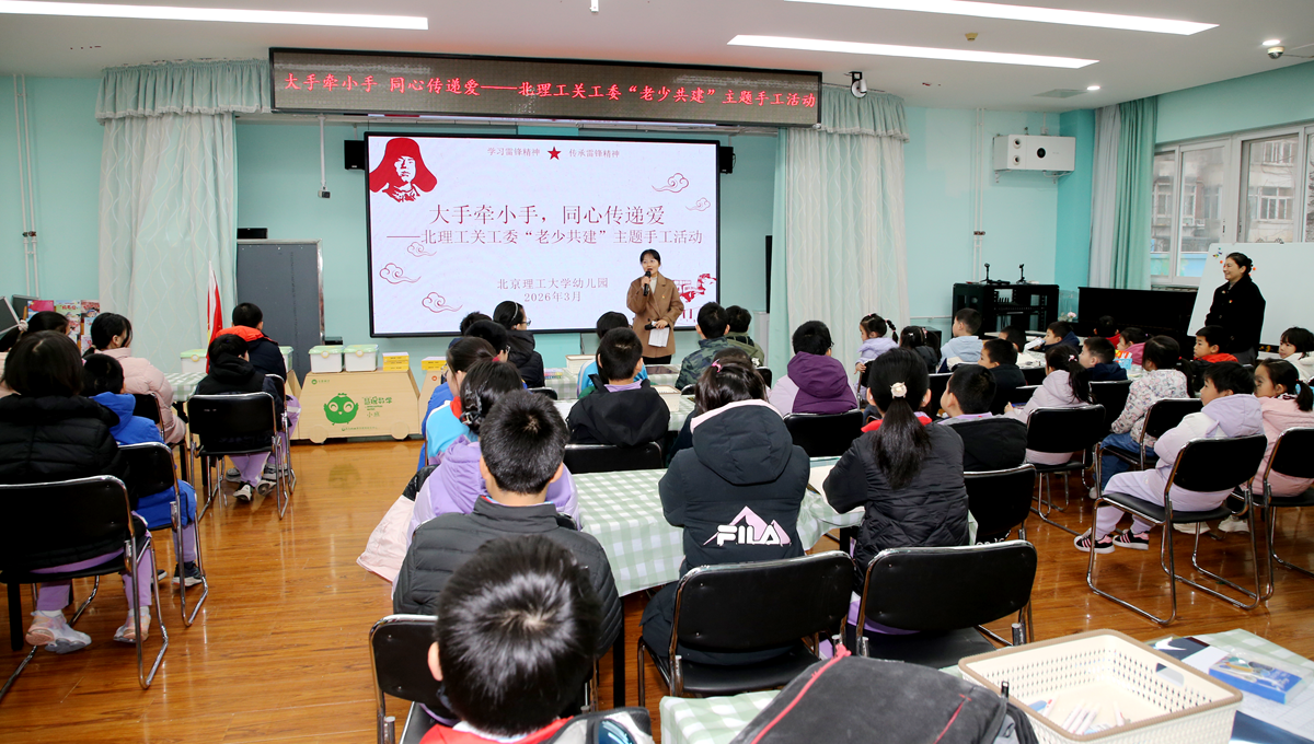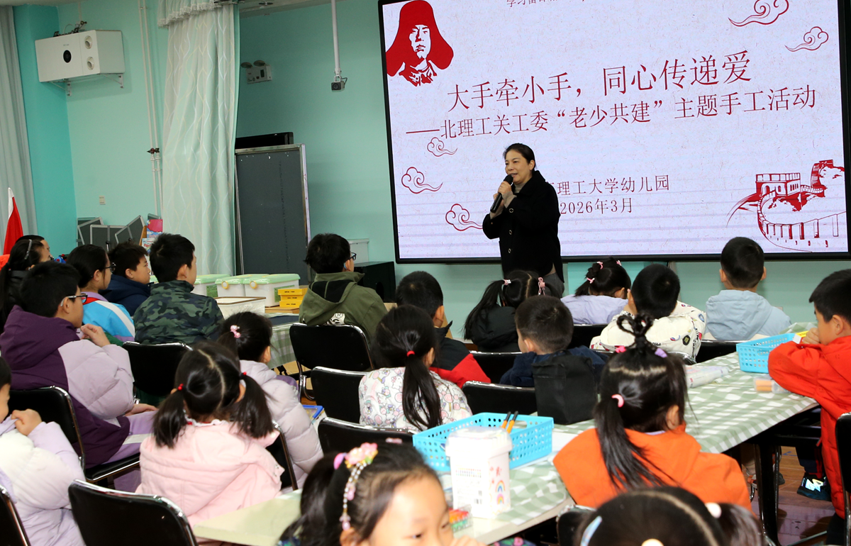 为献礼理工幼儿园建园75周年,2026年3月13日,北京理工大学关工委联合理工附小、理工幼儿园,共同开展“大手牵小手,同心传递爱”老少共建主题手工活动。学校关工委秘书长、离退休教职工党委书记董兆波,幼儿园退休教师党员代表,理工附小六年级(5)班学生、幼儿园大班小朋友,以及在职教师党员等70余人齐聚一堂,围绕鸽子装饰绘画、延安宝塔山浮雕创作,分设13个特色小组,携手完成了一场温馨而富有创意的手工实践。活动由幼儿园业务园长肖月佳主持并引导创作。