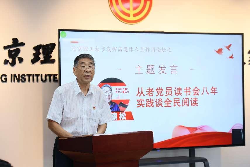 北京理工大学校档案馆王征为论坛致辞。他介绍了北京理工大学文化建设成果经验,肯定了老同志在大学文化建设中的重要作用,强调了阅读对于大学文化传承的重要性和在思想教育、精神传承、文化传播等方面的重要作用。鼓励老同志进一步发挥作用,加强阅读引领,参与阅读风尚,不仅把阅读作为自身终身学习的追求,更把倡导阅读作为关心关爱青少年成长发展的有效方式,倡导青少年爱读书,读好书,善读书,搭建起沟通几代人的文化桥梁,推动书香北理,书香北京的建设。