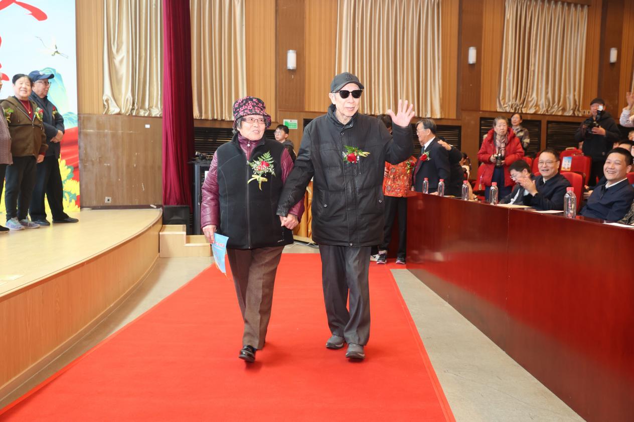 在全场观众热烈的掌声中,来到现场的七对金婚、钻石婚伉俪手挽着手、肩并着肩走上红毯、步入舞台,每一步都满含岁月沉淀的深情,成为现场最动人的风景线。