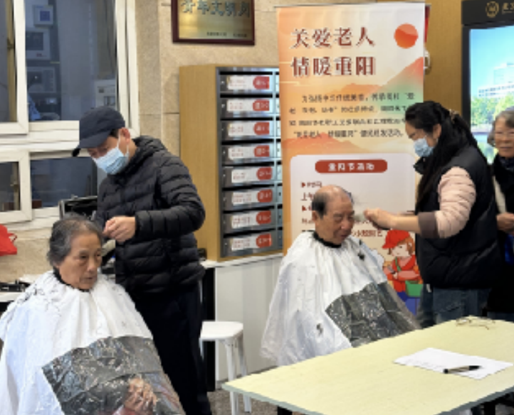 7号楼大厅内设置了“重阳打卡点”,老同志们与家人、老友在打卡点拍照留念,记录节日喜悦;同时,学校组织志愿者为老年人提供免费理发活动,让老同志们在温馨互动中感受学校的关怀。