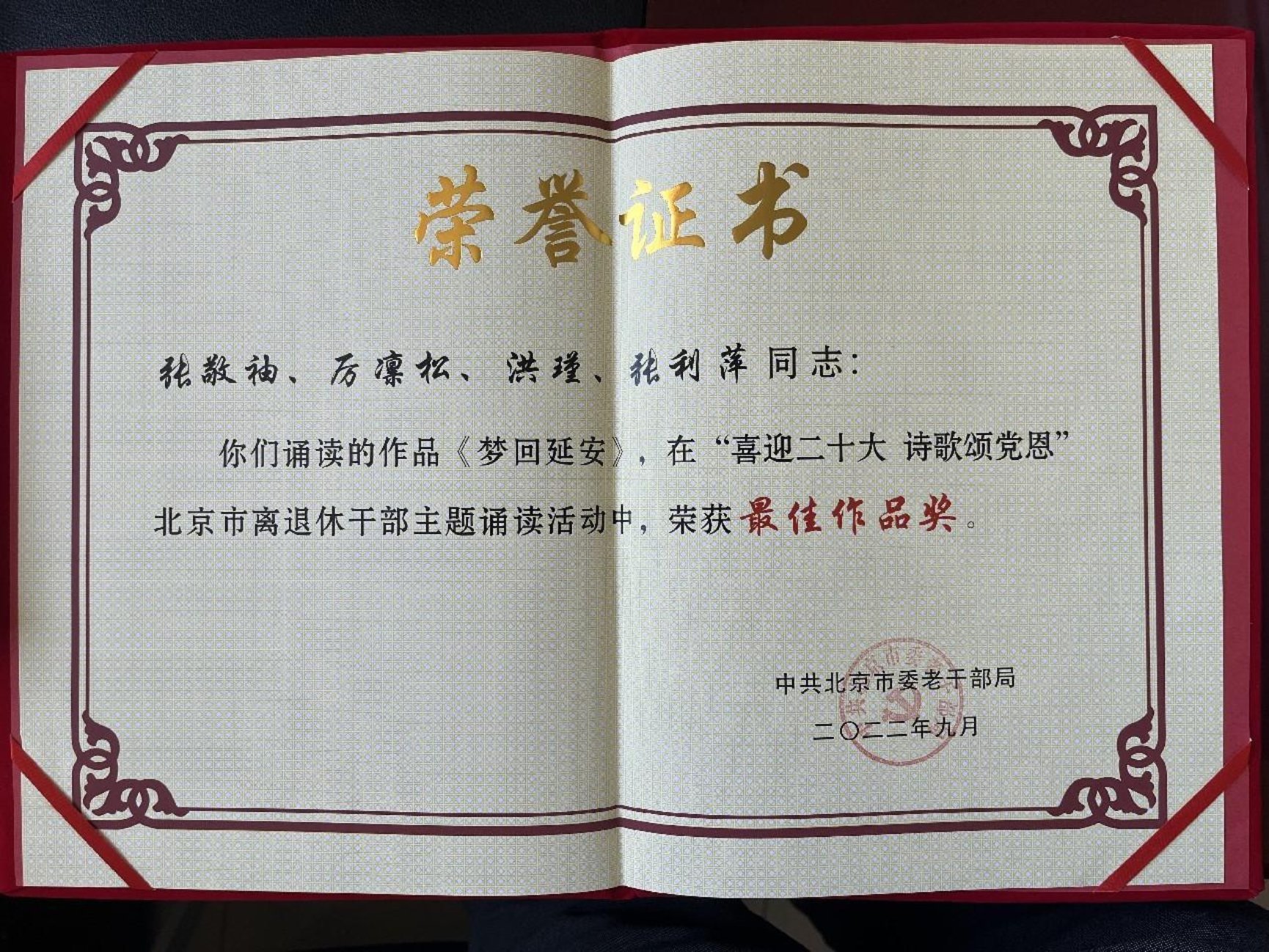 为喜迎党的二十大胜利召开,唱响首都离退休干部礼赞新时代的正能量之歌,9月15日下午,北京市委老干部局在北京广播大厦举办“喜迎二十大 诗歌颂党恩”北京市离退休干部主题诵读颁奖活动。我校选送朗诵节目《梦回延安——献给党的二十大的赞歌》获得“最佳作品奖”。