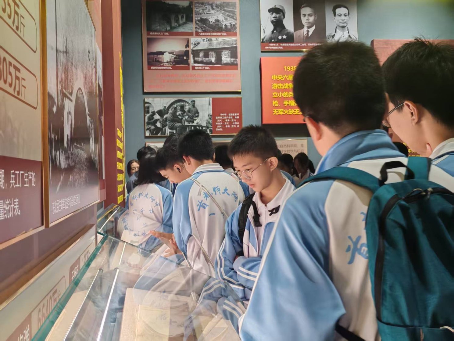 中学的师生们首先来到学校文博中心,参观“挺起民族的脊梁——党领导的人民军工”展览。在讲解员的引导下,同学们沉浸于北京理工大学延安自然科学院建校以来的光辉历程,一件件珍贵的实物、一幅幅厚重的图片,生动再现了学校“延安根、军工魂”的红色基因与为国防科技事业做出的卓越贡献。