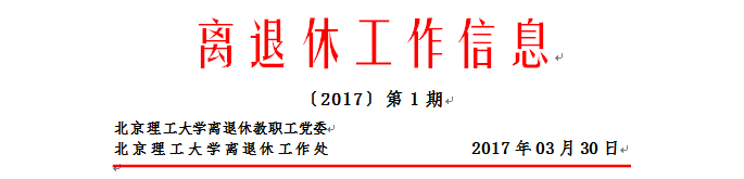 ● 3月17日,北京理工大学离退休工作领导小组召开年度会议。校党委书记赵长禄,常务副校长杨宾,离退休工作领导小组成员单位负责人参加会议。会议由杨宾主持。会议学习和传达了中共中央办公厅、国务院印发《关于进一步加强和改进离退休干部工作的意见》(中办发〔2016〕3号)和中共北京市教育工作委员会印发《关于加强和改进北京高校离退休干部工作的实施意见》(京教工〔2017〕16号)等文件。与会人员重点围绕如何加强离退休干部思想政治工作、完善和创新离退休干部服务管理工作、加强离退休干部组织领导等内容进行了研究部署。