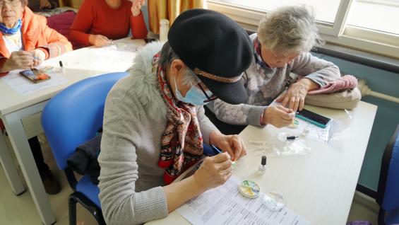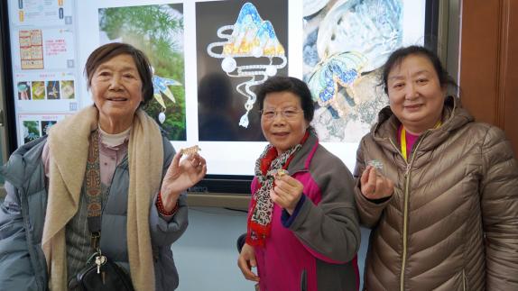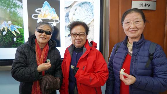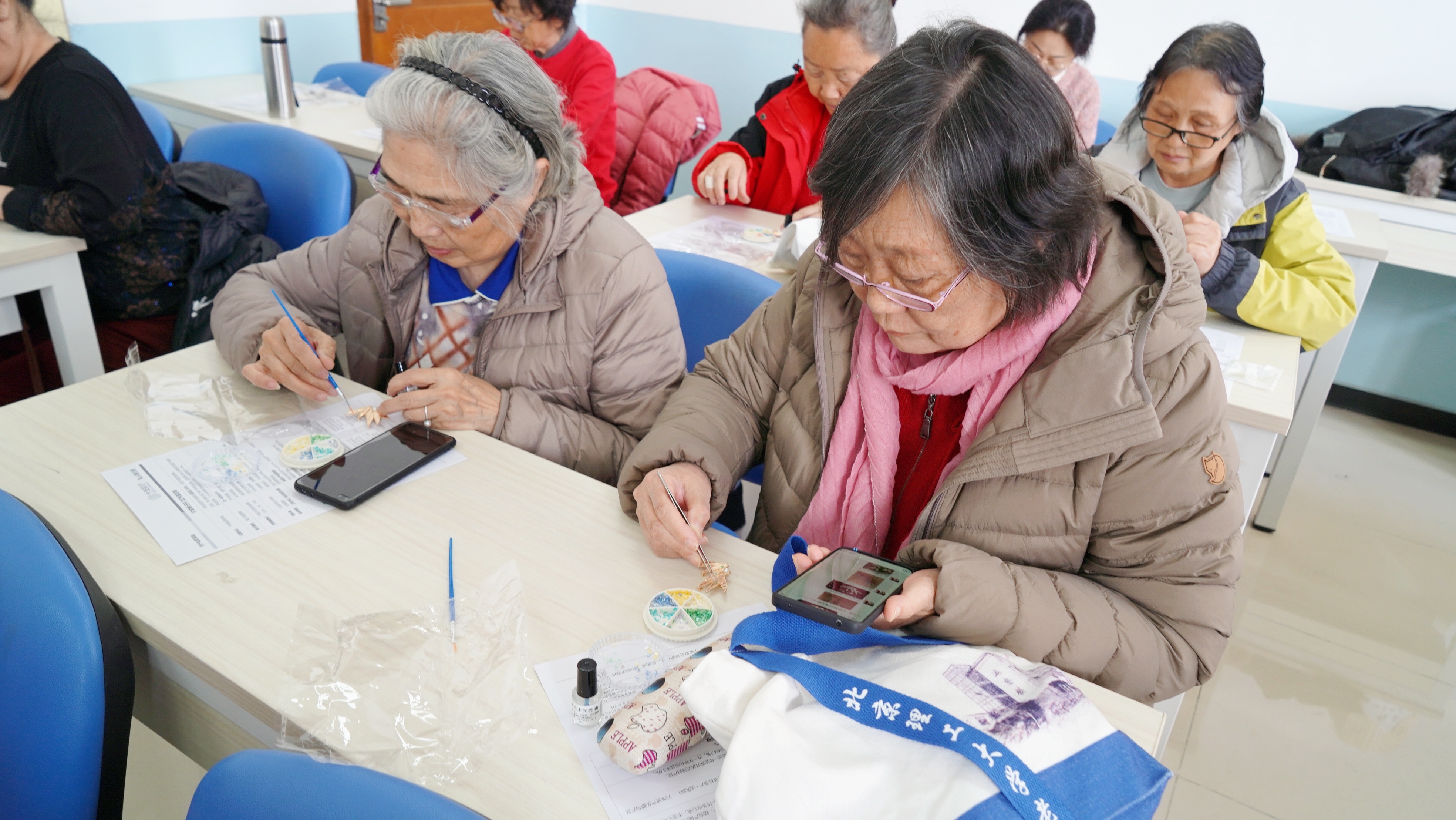 在志愿者的细致讲解下,老同志们充分发挥自己的想象力和创造力,用特制胶水将裁剪好的螺钿片粘贴在金属底托上,不断调整角度,让螺钿片的光泽能以最佳状态呈现,搭配出个性定制的美丽图案。